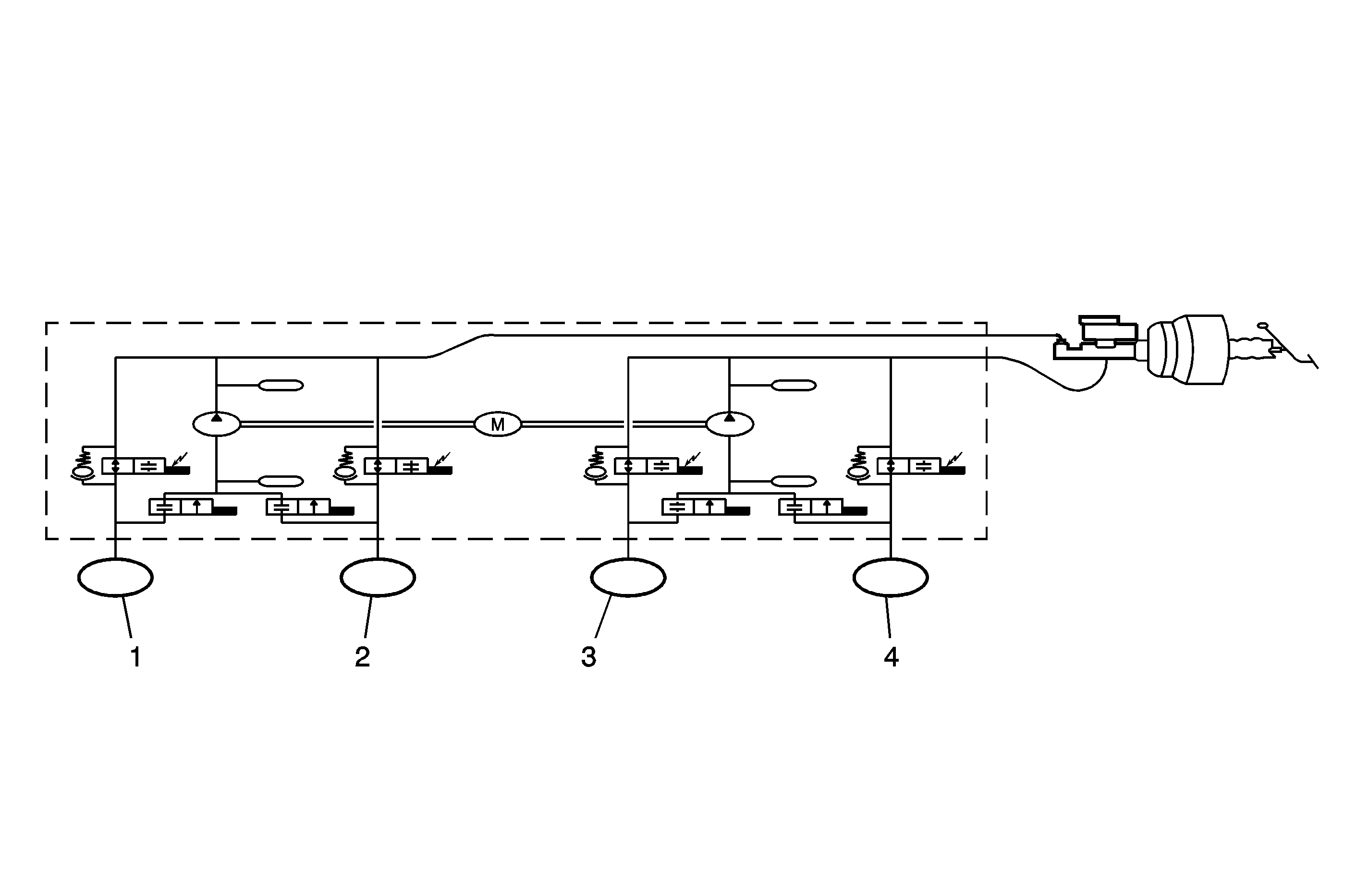 The baseline braking mode of the ABS system used in this vehicle is a diagonal split system. In this system, one master cylinder circuit supplies pressure to the right front and the left rear brakes; the other circuit supplies pressure to the left front and the right rear brakes. All valves in the hydraulic modulator are in their normal, non-energized positions.